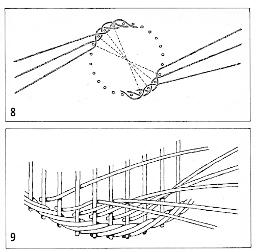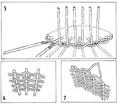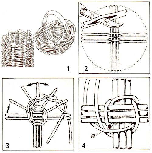 Gli ottimi disegni presi da: Il manuale del trapper di Andrea Mercanti (prima edizione 1976 circa), spiegano in maniera chiara i passi da seguire per costruire cesti, panieri, canestri, gerle e contenitori vari.