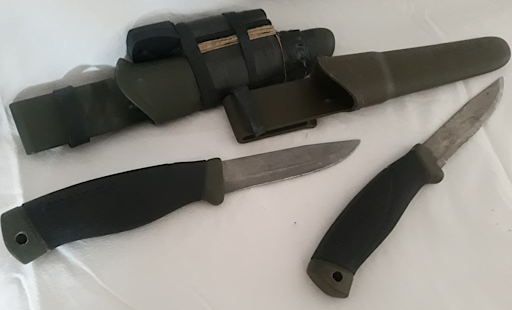 - Coltello Mora Companion normale e heavy duty. I coltelli companion sono conosciuti e apprezzati in tutto il mondo e non hanno bisogno di presentazioni. Ne possiedo 4 (2 al carbonio, uno normale, uno heavy duty e 2 in acciaio inox, che sono distribuiti con altro marchio) e hanno più o meno le stesse caratteristiche: costruzione hidden tang, lama a Filo piano, affilatura cosiddetta scandi, con lunghezza di 10,2 cm. circa e spessore di 2,5 cm. (3,2 l’heavy duty); il materiale della lama può essere acciaio inossidabile Sandvik 12C27 con durezza 57/58 hrc, oppure acciaio al carbonio UHB20C (1095) con durezza 58/60 hrc. Il materiale del manico è di plastica rigida e gomma con ottimo grip. Hanno un fodero in plastica. La lunghezza totale è di circa 21,8 cm. I miei coltelli in acciaio inox hanno una marca diversa da quelli al carbonio, ma la casa costruttrice è la stessa. Quando compro questi coltelli, non hanno il foro nella parte finale del manico. Lo faccio con un trapano e punta da 4 mm.. Il punto dove pratico il foro è di plastica dura e non ho mai avuto controindicazioni dopo la foratura. Poi limo un pezzo della parte superiore della lama (che presenta ancora la bava dello stampo) per renderla a spigolo vivo e utilizzabile con l’acciarino, che poi adatto quasi sempre sul fodero. Il coltello al carbonio heavy duty (HD) pur mantenendo la stessa lunghezza di lama e la stessa costruzione del companion normale al carbonio, ha uno spessore della lama di 3,2 mm. e anche il manico è più grande (vedi seconda foto). Le lame dei coltelli in carbonio delle foto sono state brunite con aceto caldo. Il trattamento si rivela efficace e previene il formarsi della ruggine. https://www.sopravvivere.org/brunitura-aceto-caldo-e-acciaio-al-carbonio/