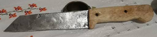 Finalmente ho trovato il tempo per rifare il manico ad un vecchio coltello. Non so con che legno ho rifatto il manico. Ho alcune guancette di circa 10 anni fa e non ricordo più di cosa sono. Nella foto si vede il manico montato e incollato con colla bicomponente. Mancano i rivetti. Ce li volevo mettere di rame, ma al momento non sono riuscito a trovare un tondino di rame da 5 mm.. Il coltello è veramente vecchio. Si tratta di acciaio al carbonio, probabilmente un C45 derivato dalla balestra di un’auto. Forse in origine era stato costruito per lavori pesanti di cucina o macelleria. Io ce l’ho da circa 25 anni e apparteneva allo zio di mia moglie. Forse è costruito a mano da qualche fabbro locale dell’epoca (alto lazio). Non è un full-tang. L’acciaio arriva più o meno a un centimetro sopra il secondo foro. Ha lavorato tanto, lo utilizzavo sopratutto per tagliare la ginestra, il salice, il venco e il vimini per i canestri, le canne, la corteccia di betulla e acero … ma è ancora efficiente e affilatissimo. La punta originale non c’è più, si è rotta. Ho cercato, una ventina di anni fa, di rifare una punta utile e facile. Quando sarà finito gli farò anche un fodero.