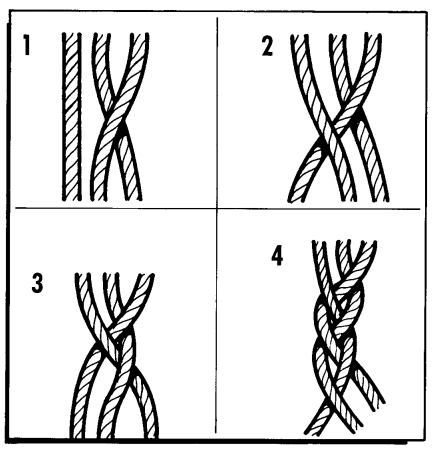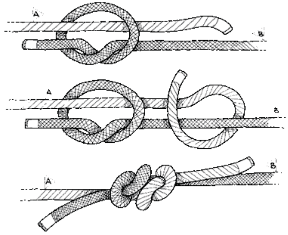 È più conveniente lasciare l’intreccio non troppo stretto e più morbido (le spire poco strette) in modo che rimanga più flessibile. I tre capi possono essere anche attorcigliati e poi alla fine fermati con un nodo in modo che le spire non si riaprono. I metodi per intrecciare se ben utilizzati, sono comunque tutti validi. Un mio anziano vicino di casa di tanti anni fa (oggi avrebbe circa 120 anni), dopo aver tenuto le fibre a bagno per tutta la notte, le univa tre o quattro con un nodo e poi sempre bagnate le faceva roteare sulla gamba con il palmo della mano, poi legava la parte terminale con un altro nodo e otteneva ottimi spezzoni, le spire asciutte non si muovevano più. Per ottenere corde più lunghe si uniscono infine gli spezzoni (qualsiasi sia l’intreccio utilizzato) tra loro con un nodo adatto come quello dell’immagine sotto, chiamato nodo del pescatore o nodo inglese (funziona meglio se i diametri sono simili).