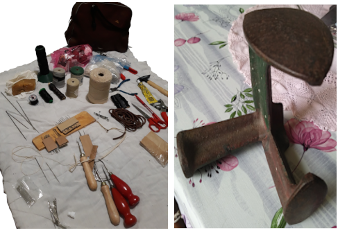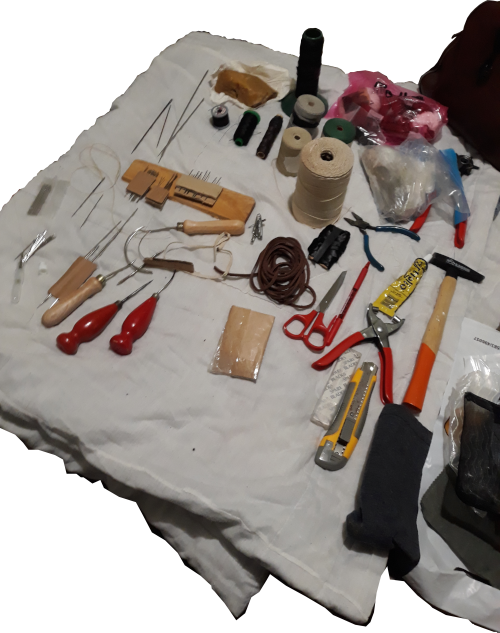Confeziono e riparo da solo tutto quello che mi può servire a livello personale (abbigliamento escluso), contenitori, buste, sacchetti, borse, foderi e custodie, … . Inoltre so rammendare e riparare l’abbigliamento, calzature comprese. Tengo tutto l’occorrente in una vecchia borsa e devo dire che ho una buona quantità di materiali. L’attrezzatura, tutta manuale è composta da pinze, forbici, fustellatrice, occhiellatrice, taglierina, martello e una vecchia incudine da calzolaio. Naturalmente poi ci sono gli aghi e le lesine, con assortimento tale da soddisfare moltecplici utilizzi (ho anche aghi grandi per cucire materassi di fortuna realizzati con lana di ovini). Anche i fili per cucire sono molti e di prima qualità. La robustezza del filo e la sua capacità di resistere all’usura sono le due cose principali che considero.