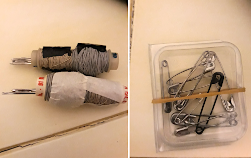 Diversa cosa è il materiale per cucire e rammendare che porto nel kit di sopravvivenza, c’è qualche metro di filo avvolto in rocchetti di plastica recuperati, e alcuni aghi e spille da balia. Porto sempre una buona quantità di aghi e spille perché in emergenza possono avere molti utilizzi. come scritto sopra non mi preoccupo se il filo per cucire non è molto, ho sempre il paracord che ha le corde interne fatte con filamenti attorcigliati ottimi per cucire e la rafia sintetica che utilizzo come utilizzavo un tempo il tendine artificiale. Il paracord e/o la rafia sintetica sono corde che cerco di tenere sempre in un kit.