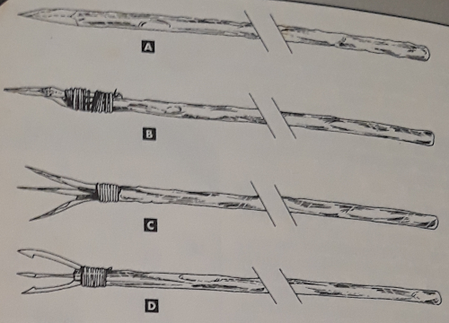 Fare le spaccature che servono su una cima del bastone, a seconda del numero di punte il legno va sempre sezionato in parti uguali e alla base dei tagli che devono essere di 15/20 cm. si deve legare una corda a stringere, in modo che il legno non continui a rompersi. Le sezioni ricavate devono essere allargate posizionando due piccoli bastoncini alla base dei tagli fatti che le faranno tenere divaricate. Appuntire le estremità superiori delle sezioni agendo con il coltello sui lati interni, così si aumenta la distanza tra le punte. La parte appuntita deve essere affilata per perforare ma ancora robusta che non si rompa. Se si passano poi le punte nel fuoco, si induriscono e aumentano la resistenza. Anche i bastoncini precedentemente inseriti devono essere legati con della corda. Per le lance delle figure A e B, si può utilizzare anche bastoni di legno con diametro non troppo grande (max. 2 cm.) fatte con legno abbastanza flessibile. La punta si indurisce al fuoco come le altre.