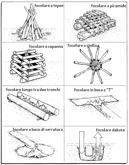 Un altro focolare può essere quello in cui si mette intorno all’esca la legna (prima fina poi sempre più grossa) secondo il metodo cosiddetto a capanna, sovrapponendo i legni con metodo incrociato. Il flusso d’aria potente che si crea con questo sistema, fa si che sul bracere ci sia sempre una fiamma viva e grande. Il focolare a piramide è molto simile e praticamente ha la stessa funzione.