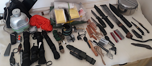 Quello che segue è l’elenco della mia attrezzatura, disponibile per realizzare un KIT di sopravvivenza, oppure due kit: uno da tenere in macchina (le leggi italiane sul porto di armi e di coltelli limitano notevolmente i kit da auto) e uno da tenere in casa. Oltre naturalmente all’EDC da portare sempre. Tutta l’attrezzatura che non viene utilizzata per i kit principali, la conservo in un unico luogo, in sacche e scatole, per averla eventualmente disponibile se si rendesse necessaria.