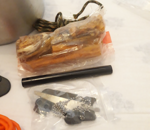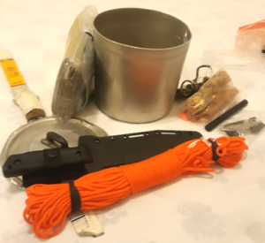Il fuoco è determinante e, dopo un attrezzo da taglio e un pentolino è la parte da curare maggiormente in un kit. Non bisogna avere solo uno strumento per accendere il fuoco, bisogna essere abbastanza sicuri di ottenere un fuoco, anche se le condizioni climatiche sono avverse. Quindi occorre un acciarino con strike e servono anche esche varie per il fuoco, infiammabili abbastanza facilmente: resina di pino essiccata, pezzi di cotone idrofilo e corde di iuta o canapa impregnati di olio, bustina con alcune pezze di cotone carbonizzato (char cloth), legno di pino resinoso (fat wood). Queste sono le esche per il fuoco che mi autocostruisco. Durante l’inverno cerco pini secchi e taglio alcuni rami rotti alla base. Rami non grossi, 5-8 cm. di diametro. Questi rami sezionati in stecchi rettangolari, sono ricchi di resina e facilmente infiammabili. Durante l’accensione del fuoco vengono spellicolati a formare dei “piumini” e/o grattati per ottenere un composto facilmente infiammabile. Questi legnetti si possono trovare anche in commercio (fatwood). Gli attrezzi per il fuoco, se posso, li metto sempre in generosa quantità (esempio 2 acciarini e anche un accendino usa e getta, una lente di ingrandimento per sfruttare il calore del sole, …).