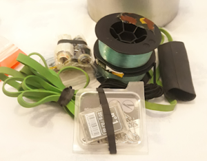 Dopo gli accessori per il fuoco mi occupo del cordame, che è quasi sempre costituito da una matassa di paracord di circa 30 metri, qualche cordino, rafia sintetica un conetto da 100 gr. (circa 150/200 mt.). Porto anche qualche elastico grande (anche uso laccio emostatico se necessario o fionda) e se entra un pacchetto di fascette in pastica di quelle utilizzate per cablare i cavi elettrici ed elettronici. Infine porto anche dei piccoli rotoli di filo di ferro zincato tipo quello usato nel giardinaggio. Normalmente sono rotoli da 50 metri x 0,8 mm. di spessore. Il cordame non è mai troppo. Si tratta di materiale leggero, flessibile e malleabile e nella preparazione di un kit trova sempre posto un po di cordame in più pressato in qualche angolino vuoto.