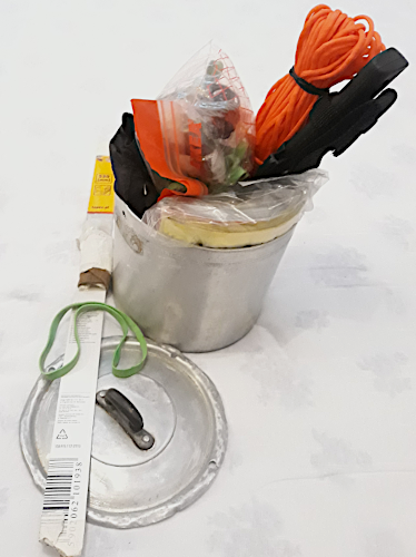 – un contenitore per trasportare l’acqua, meglio se di metallo (alluminio, acciaio, ghisa, …), perché se si riesce ad avere il fuoco è utile per bollire l’acqua e cuocere