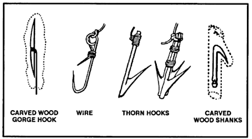 - ami a gola: questi ami sono dritti, lunghi 2 o 3 cm. e appuntiti alle due estremità. Si possono costruire con legno duro o osso. Al centro si pratica una tacca dove si lega il filo. Questo tipo di amo, quando il pesce lo ingoia con l’esca, gli si gira di lato e si incastra nella gola. Tirare lentamente la lenza per portare fuori il pesce.