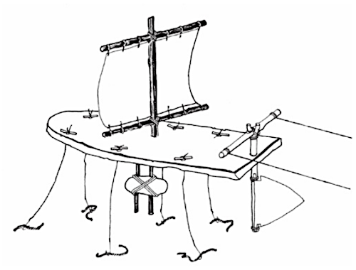 - Con lo stesso metodo sopra si crea una piccola piattaforma galleggiante tipo zattera, rettangolare o quadrata (fatta anche solo di due o tre legni leggeri e galleggianti legati insieme) e ci si attaccano le lenze. si spinge verso le acque più profonde del centro e si tiene assicurata ad una corda, in modo che si può riportare a riva velocemente quando si notano “movimenti” che indicano la presenza di almeno un pesce catturato. Sopra può essere dotata anche di una piccola vela in modo che il vento la faccia “navigare” casualmente.