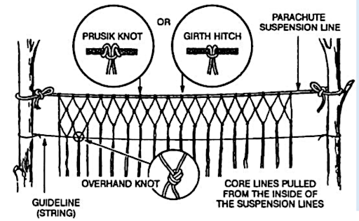 Una rete può essere utile in molte occasioni. costruirla è semplice e, a seconda dello spessore della corda e dell’ampiezza delle maglie, si può utilizzare per molti usi. La figura sotto (presa dal manuale: Search and Rescue SURVIVAL TRAINING (AF REGULATION 64-4 VOLUME I, 15 July 1985), mostra il metodo di costruzione della rete (abbastanza facile). Gli utilizzi più comuni sono: zaino o sacca per il trasporto di varie attrezzature (legna per il fuoco, pietre e materiali vari), rete da pesca o nassa, se si tengono più strette le maglie si può fare un’amaca o rete per il letto.