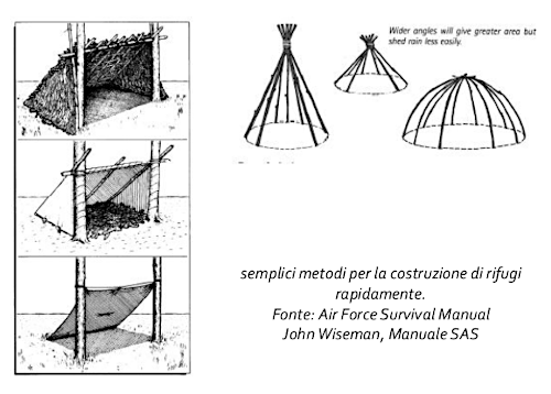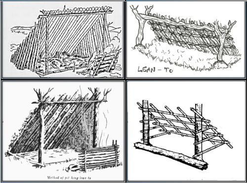 Letteralmente il termine può essere tradotto con l’italiano tettoia. In pratica si tratta di una struttura di legni o pali disposti obliquamente e appoggiati ad un tronchetto superiore orizzontale che fa da trave, tenuto da due pali piantati per terra oppure da una biforcazione presente in un albero. Si inizia con il fissare bene il palo superiore orizzontale, che deve essere sicuramente robusto perché alla fine deve tenere in piedi tutta la struttura, copertura (di qualsiasi cosa sia fatta) compresa. Si stabilisce poi l’obliquità dei pali appoggiati (l’obliquità determina lo spazio interno per l’alloggiamento principale). quando ho deciso a che distanza dalla trave orizzontale posizionare la base dei pali obliqui, non appoggio direttamente i pali a terra, ma scavo un solco leggero in modo che i pali si interrano per 5-10 cm. Si completa infine la struttura con l’inserimento orizzontale di rami fini flessibili, intrecciandoli con i pali obliqui (alternativamente passano fuori e dentro i pali, come se si facesse un canestro). Se si decide per la tecnica dell’intreccio, i pali obliqui vanno fissati sulla trave posteriore orizzontale dopo che sono stati inseriti rami flessibili orizzontali, perché farli entrare dall’alto è relativamente semplice, infilarli da un lato è molto più difficile. Ovviamente i rami flessibili orizzontali possono anche non essere intrecciati, ma legati semplicemente. Quella descritta è la struttura di base, si può considerare finita, ma può essere anche migliorata in molti modi. Sicuramente i lati triangolari dovrebbero essere chiusi, in modo che il riparo risulti chiuso su tre lati e aperto solo davanti. Sul davanti, ad una distanza variabile (personalmente lo posiziono a circa 1 metro), si realizza il focolare e dietro si costruisce una barriera, in modo che il calore venga spinto verso il rifugio. Così semplicemente però, se dovesse piovere, il fuoco si spegnerebbe. Va da se che bisogna ripararlo dalla pioggia con una tettoia. Una volta costruito il ricovero Lean-to, ci si può sbizzarrire proseguendo come meglio si crede, con l’aggiunta di cose utili per proteggere il corpo dalle avversità climatiche e dai pericoli che ci potrebbero essere intorno. Come scritto in un altro articolo, preferisco sempre circondare un rifugio con un recinto, per avere più protezione e sicurezza.
