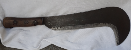 E’ una roncola abbastanza pesante e si capisce subito che è ricavata da un massiccio pezzo di acciaio. Il manico è in legno, rivettato sull’acciaio, perché la costruzione è praticamente full-tang. L’acciaio è abbastanza dolce e confrontato con attrezzi simili ho stimato che potrebbe essere un c45/c50. E’ affilata su un solo lato. Taglia molto bene.