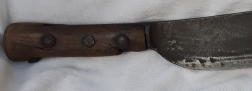 Il manico in legno purtroppo sta cedendo e lo dovrò rifare, rivettandolo come in origine (ma è difficile fare una cosa del genere), oppure avvitandolo con viti passanti. Sulla parte finale del manico forse c’era un gancio, perché si vede un pezzo di acciaio che sporge, io però l’ho avuta così com’è ora e non so dire che tipo di gancio c’era