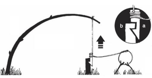 Si possono utilizzare anche corde robuste non troppo spesse (1, 1,5 mm.). Ad un capo si realizza un occhiello e si fa passare al suo interno il filo come se fosse un nodo scorsoio. L’altro capo si fissa saldamente ad un ramo, un tronco, un sasso o qualsiasi cosa che tenga bene gli strappi dell’animale. I piccoli animali possono essere presi per la gola. Gli animali più grandi per le zampe, se il filo è molto robusto e sopporta lo strappo. Il laccio si può rialzare da terra sorreggendolo con due bastoncini leggeri. Intorno dovrebbe essere ben mimetizzato e si può creare una specie di invito con rami e altro materiale, in modo che l’animale sia obbligato a passare per il laccio.